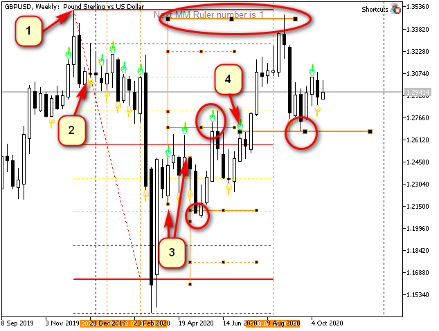 Las líneas verticales continuas (3) son un ejemplo de medición de la longitud de una vela. La longitud de estas verticales es igual a la longitud de la vela, pero aumentada 4 veces. Las líneas horizontales indican 7/8 (las continuas, del 100%, las discontinuas, de toda la longitud) de este intervalo. Los puntos de partida están indicados por flechas. Puede observar cómo el precio interactúa con los niveles indicados por estas líneas rectas (elipses rojas).