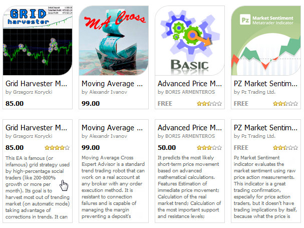 Dado que el logotipo de tamaño completo del producto no puede superar las dimensiones 200х200 píxeles (y para mostrarlo en el escaparate general es menor), es muy importante usar este pequeño espacio con el máximo de provecho, para que el posible comprador pueda tener una primera impresión positiva. Por ejemplo, veamos el experto Advanced Moving Average, su logotipo está, no sólo bien presentado, sino que al poner el cursor sobre él, se muestra una descripción breve y concisa, que aclara la idea que se implementado en la aplicación.
