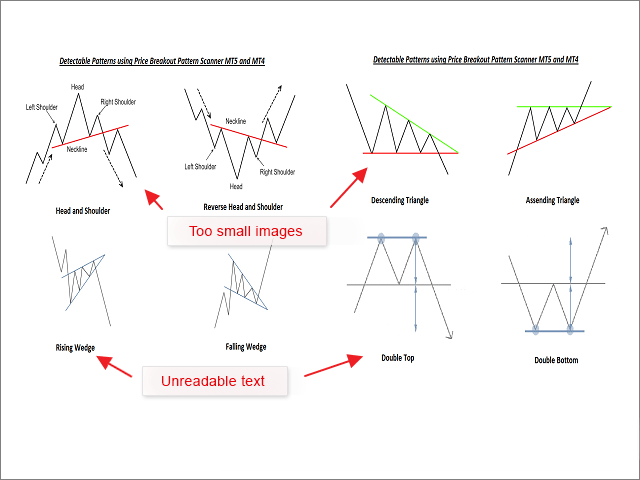 Y es que se podría haber hecho una serie de 2-3 capturas en lugar de una sola. En dichas capturas se podrían haber mostrado todos los patrones de reconociemiento a mayor tamaño, y conseguir además que el texto fuese legible. Esto también concierne a los gráficos de precio, intente no usar escalas demasiado pequeñas, dele a los usuarios la posibilidad de percibir los detalles. Y no utilice, a no ser que sea imprescindible, esquemas de color no estándar, no muestre en los comentarios texto (mensajes de la función Comment) que tape el gráfico. Destaque en los colores habituales las señales de compra y venta (azul y rojo). Una captura así no sería adecuada.