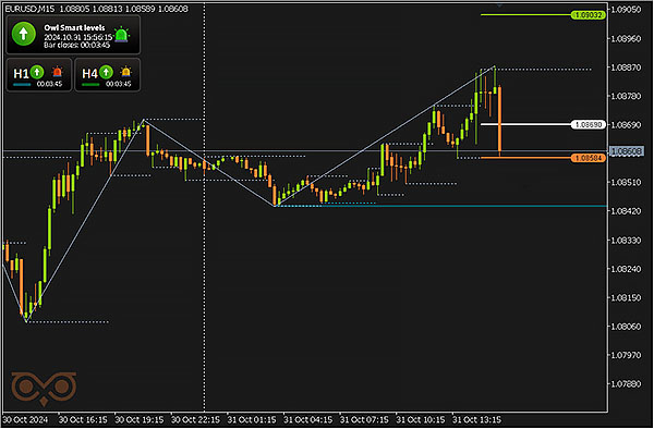 Para mayor comodidad y la recepción oportuna de las señales que uso el Indicador Owl Smart Levels. El timeframe principal de trading es M15, mientras que los timeframes H1 y H4 se utilizan para confirmar la dirección de la tendencia del timeframe superior.
