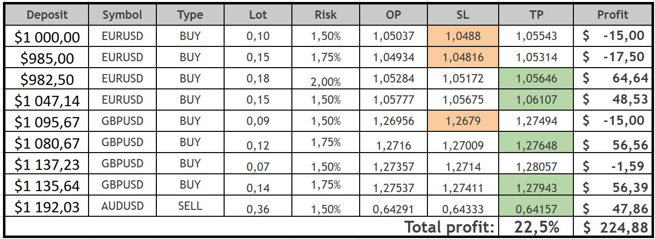 Se realizaron 9 operaciones durante la última semana de trading, el balance total es positivo. El indicador Owl Smart Levels y el sistema de trading desarrollado sobre su base han demostrado su eficacia en el trading y han aportado un beneficio muy sólido del 22,5%. De esta manera, el trading con el indicador esta semana cubrió todos los drawdowns de las semanas anteriores y dio un buen beneficio. Los datos detallados se encuentran en la tabla final.