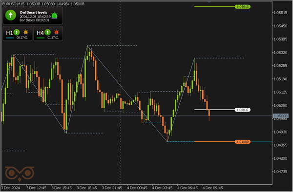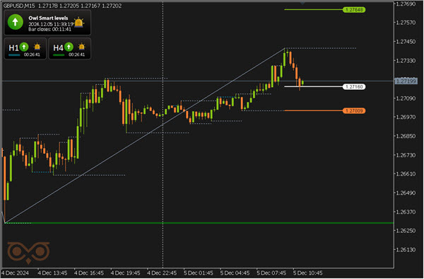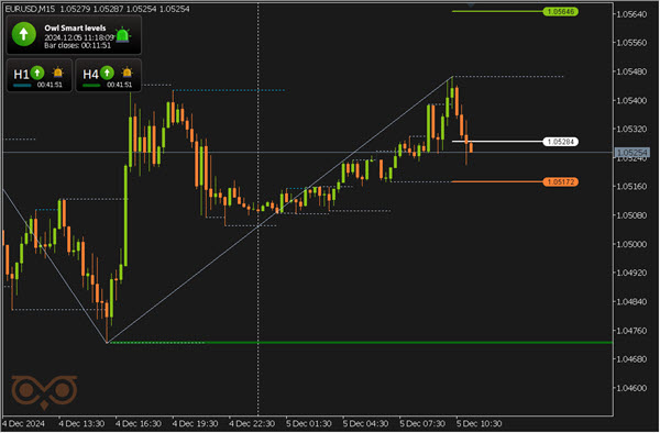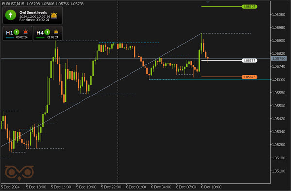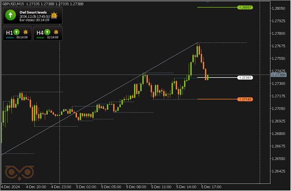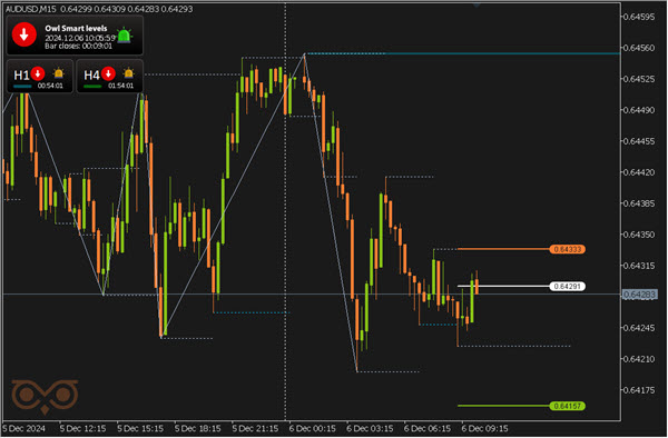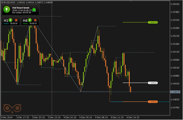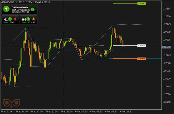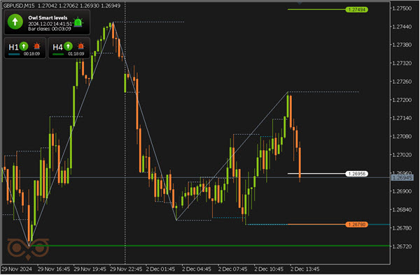 Para mayor comodidad y la recepción oportuna de las señales que uso el Indicador Owl Smart Levels. El timeframe principal de trading es M15, mientras que los timeframes H1 y H4 se utilizan para confirmar la dirección de la tendencia del timeframe superior.