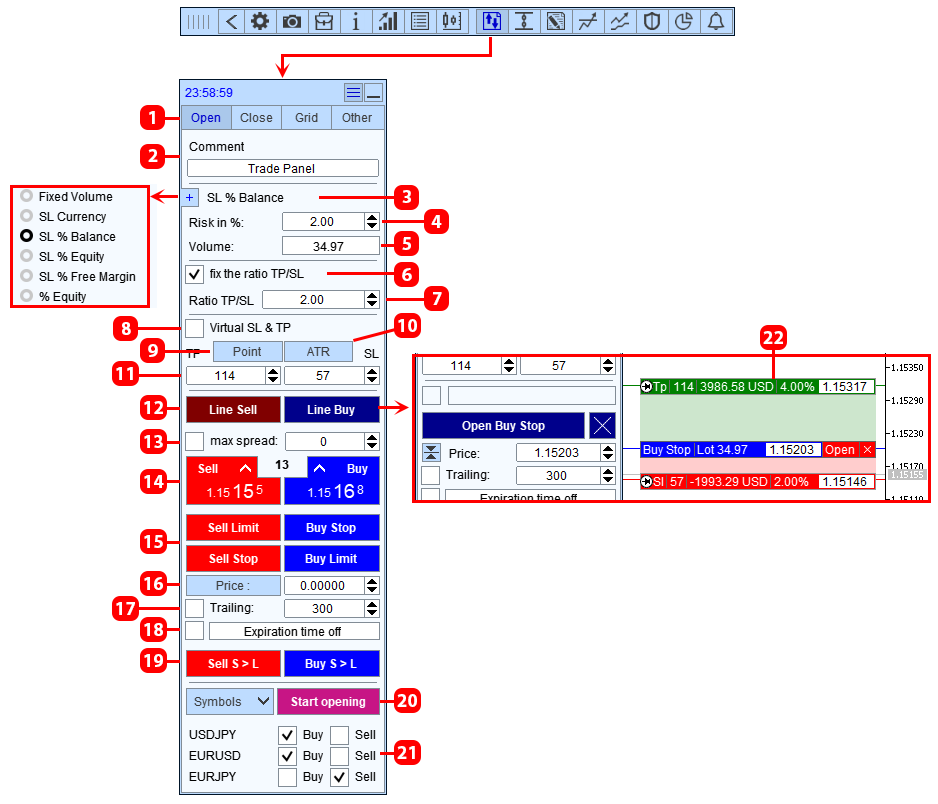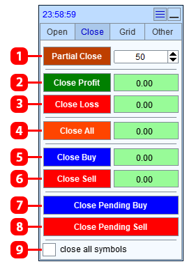 - Buy : el panel cerrará todas las posiciones de compra y abrirá una posición de venta con un volumen igual al volumen de las posiciones de compra cerradas.