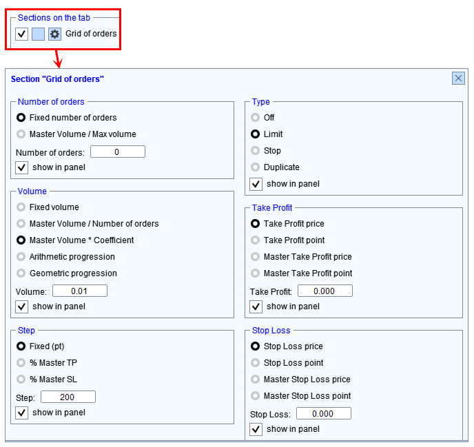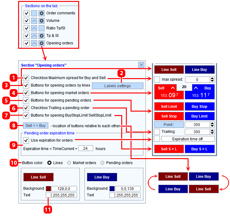 - "Órdenes de apertura" está diseñado para abrir rápidamente órdenes pendientes y de mercado, así como para abrir órdenes utilizando líneas en el gráfico. Cómo configurar una sección, vea a continuación.