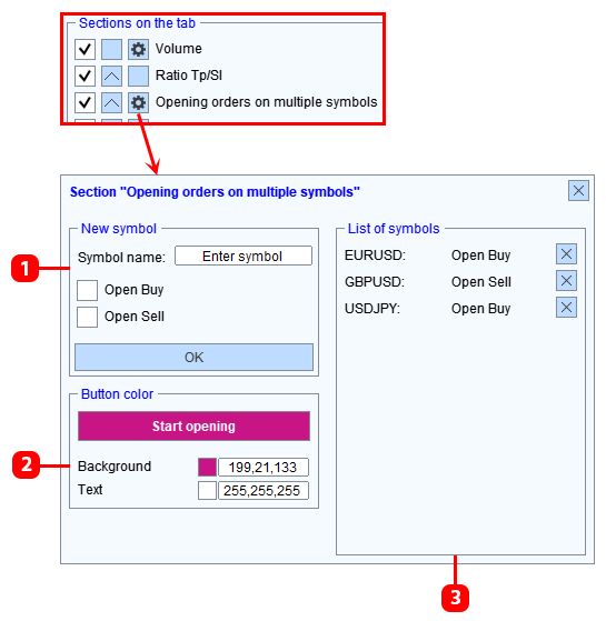 - Configurando la sección Apertura de órdenes para varios símbolos al mismo tiempo