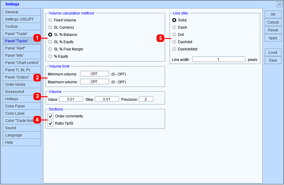- Valor – tamaño del lote o riesgo (dependiendo del método de cálculo). Este valor se puede editar desde el panel. Paso de cambio de valor. Precisión del valor (sólo para: SL % Balance, SL % Equity, SL % Free Margin y % Equity).