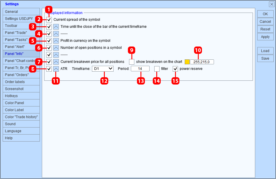 - El modo Multicurrency mode está habilitado, en este modo el panel guardará los valores de los parámetros para cada símbolo por separado. Cambiar el valor de un parámetro en un carácter no cambiará su valor para los caracteres restantes.