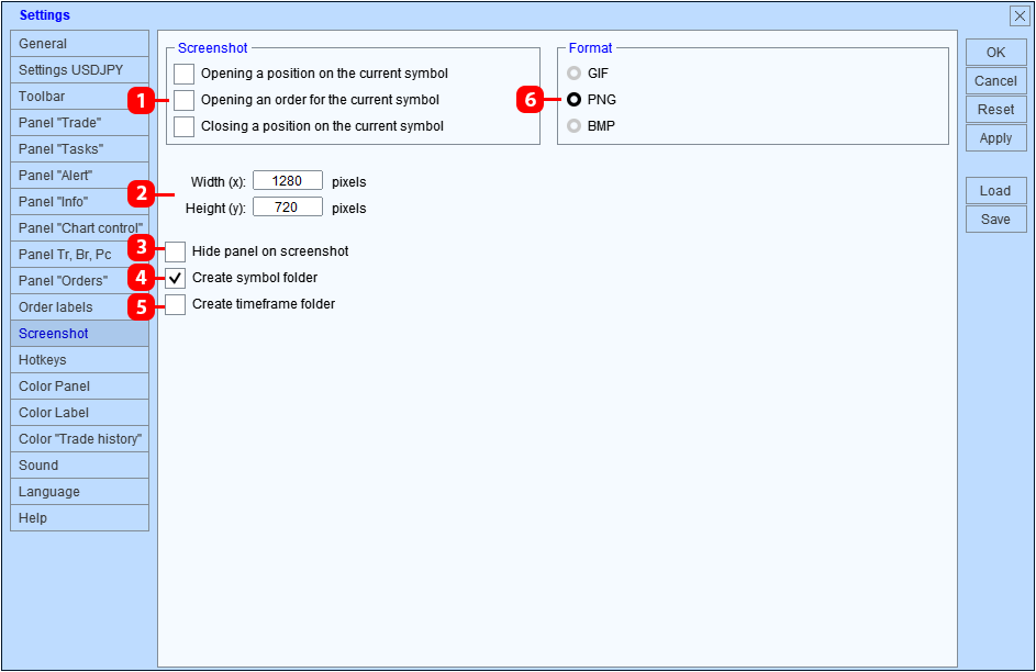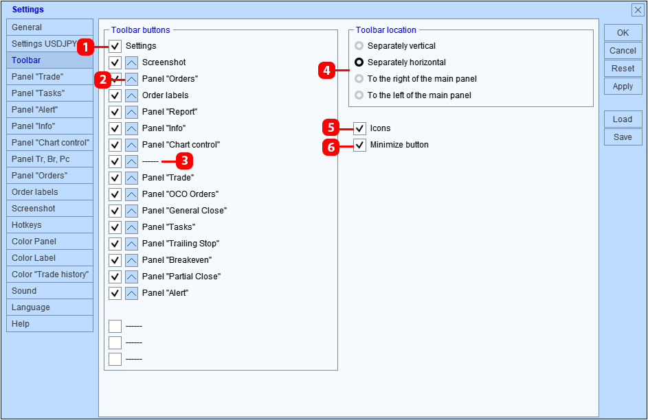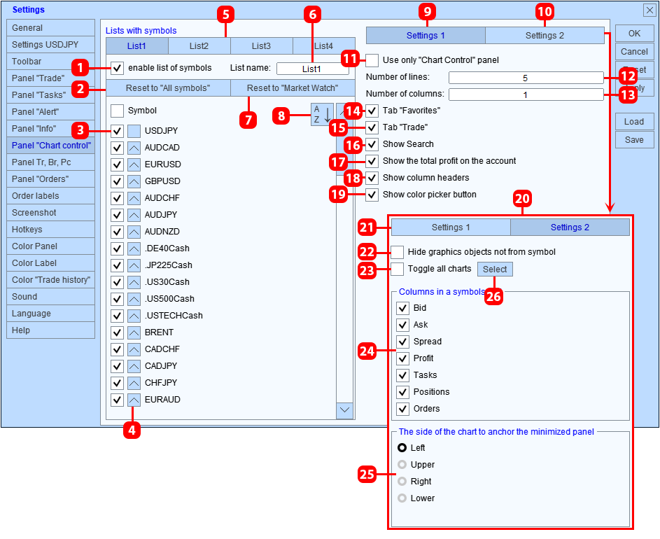 Una instancia de "Trade Panel" puede funcionar simultáneamente con todos los símbolos de un gráfico. Esto se logra cambiando los símbolos mediante el panel "Control de gráficos". Para trabajar cómodamente en este modo, el panel ofrece la posibilidad de guardar algunas configuraciones por separado para cada símbolo.