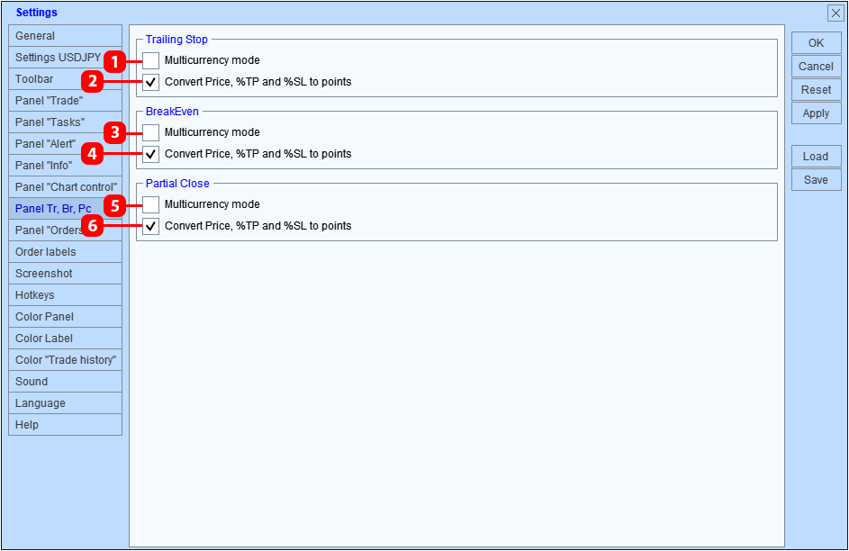 Pestaña para configurar el panel Trailing stop, Breakeven y Partial Close.