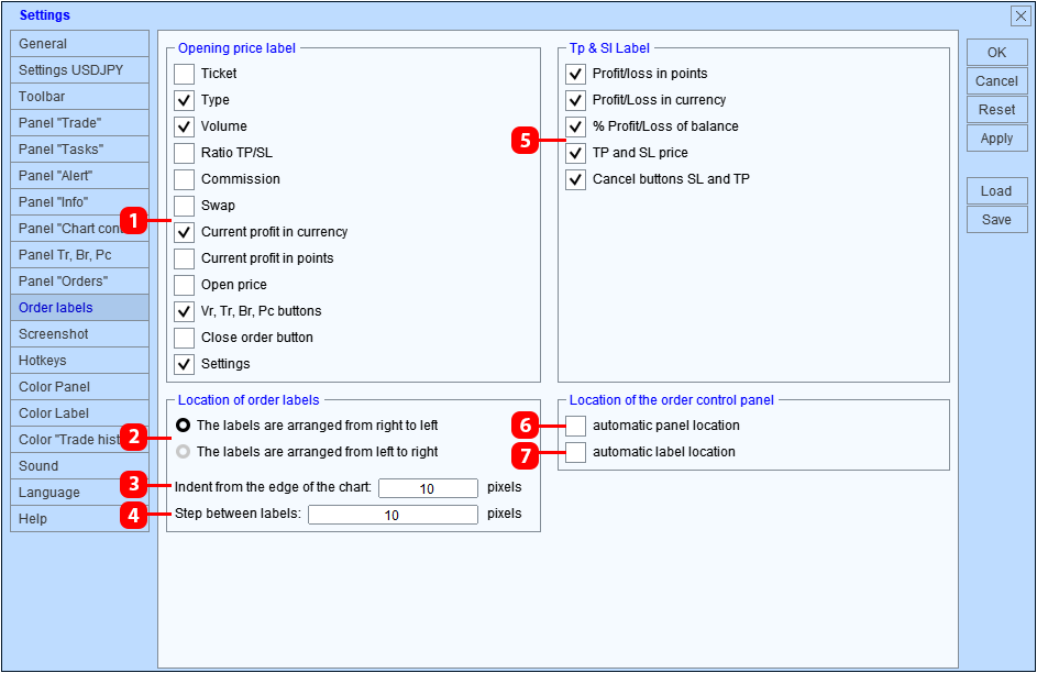 - Habilitado: la ubicación inicial de la etiqueta de control de la orden la establece el TradePanel (el panel se encuentra junto a la etiqueta original de la orden).