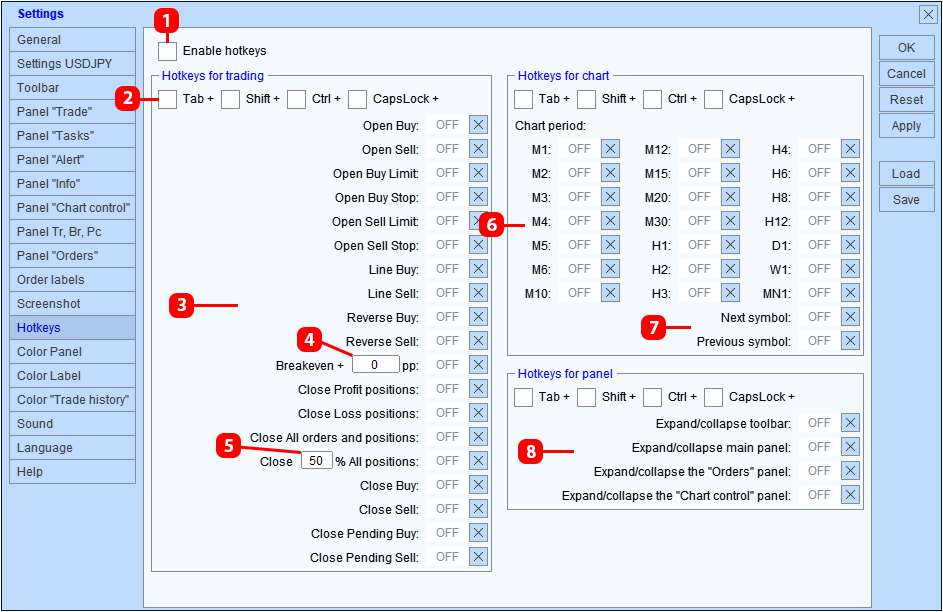 - "Establecer todas las posiciones en punto de equilibrio": tecla de acceso rápido para el botón "BreakEven", establece el stop loss de cada posición al precio al que se abrió la posición (si la ubicación del precio actual lo permite).