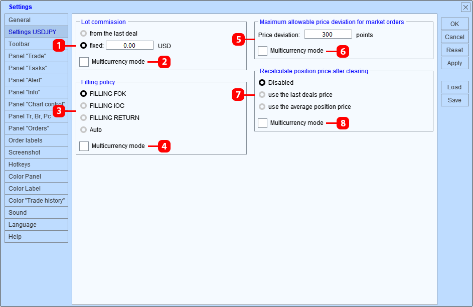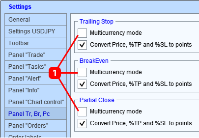 Para que el panel guarde la configuración de cada símbolo por separado, habilite la casilla de verificación "Multicurrency mode" del parámetro especificado.