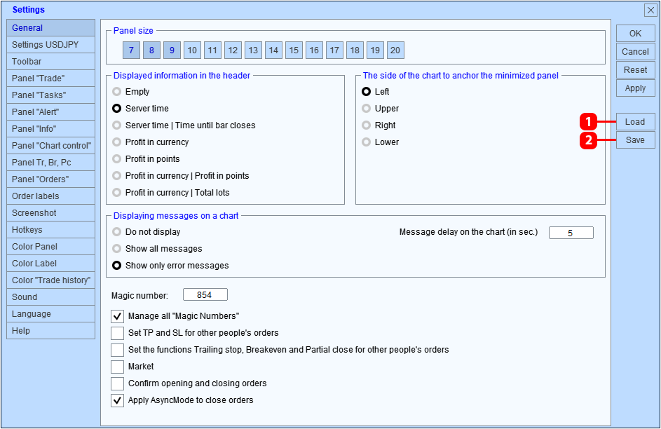 - Magic number: identificador de órdenes y posiciones abiertas mediante TradePanel. Cada experto firma sus órdenes y posiciones con un identificador (Número mágico). Esto es necesario para que el experto trabaje únicamente con sus propias órdenes y posiciones, y no las confunda con las de otros. Establezca diferentes identificadores (número mágico) para TradePanel y todos los expertos que trabajan en la cuenta comercial.