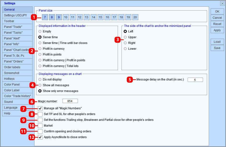 - Establezca las funciones "trailing stop", "breakeven" y "partial close" para todas las órdenes y posiciones. El panel aplicará funciones del panel Trailing stop, Breakeven, Partial Close a todas las órdenes y posiciones, incluidas las órdenes y posiciones abiertas desde el terminal móvil. El panel gestionará todos los órdenes y posiciones solo si la opción “Administrar todos los números mágicos” (7) está habilitada.