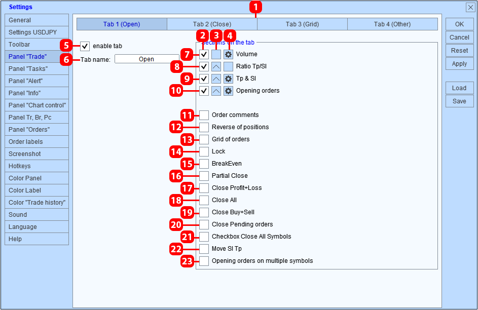 - "Cerrar órdenes en todos los símbolos". Esta sección se utiliza junto con las secciones 16 a 20.