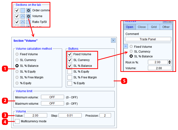 - "Volumen" está diseñado para establecer el riesgo o el tamaño del lote para una nueva orden. Cómo configurar una sección, vea a continuación.