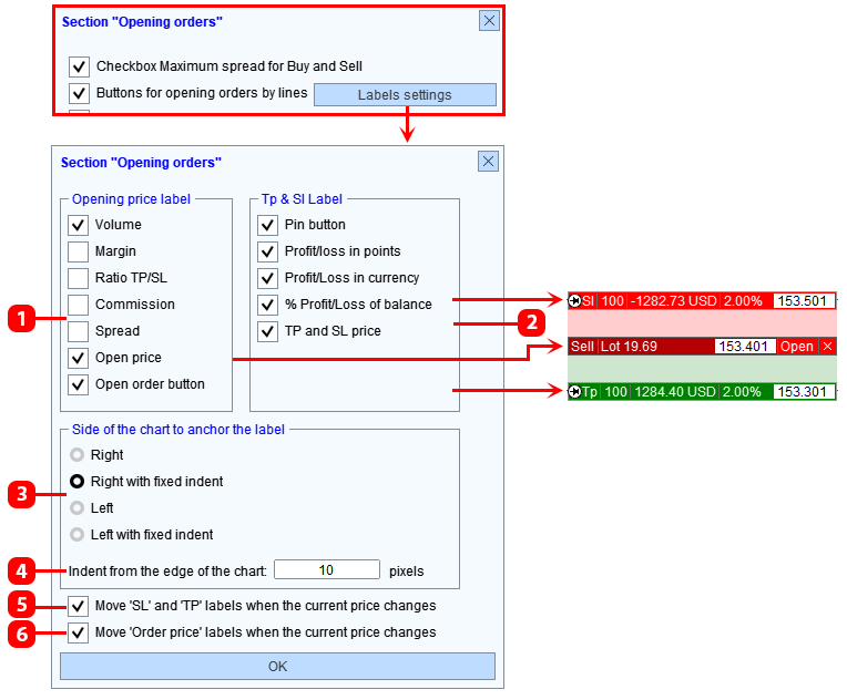 - Información que se mostrará en la etiqueta de los niveles de stop loss y take profit.