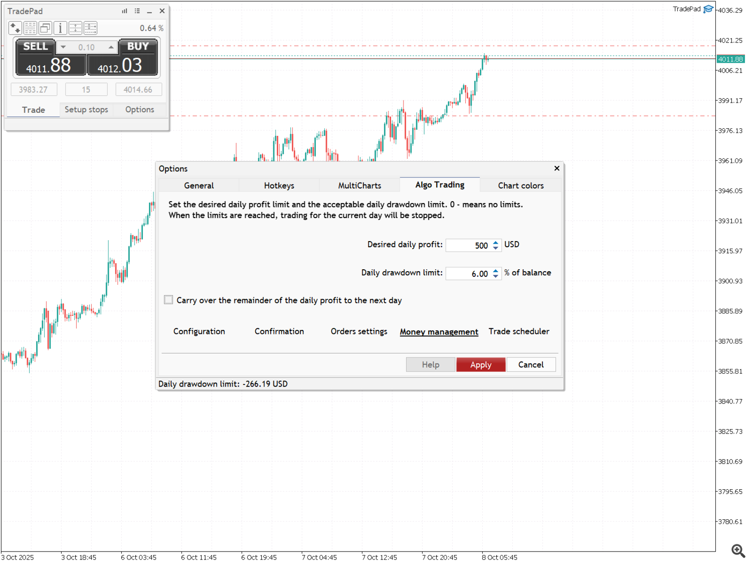 En esta pestaña puede configurar los parámetros del trading algorítmico. Contiene pestañas adicionales: "Configuration", "Confirmation", "Orders settings", "Money management" y "Trade scheduler".