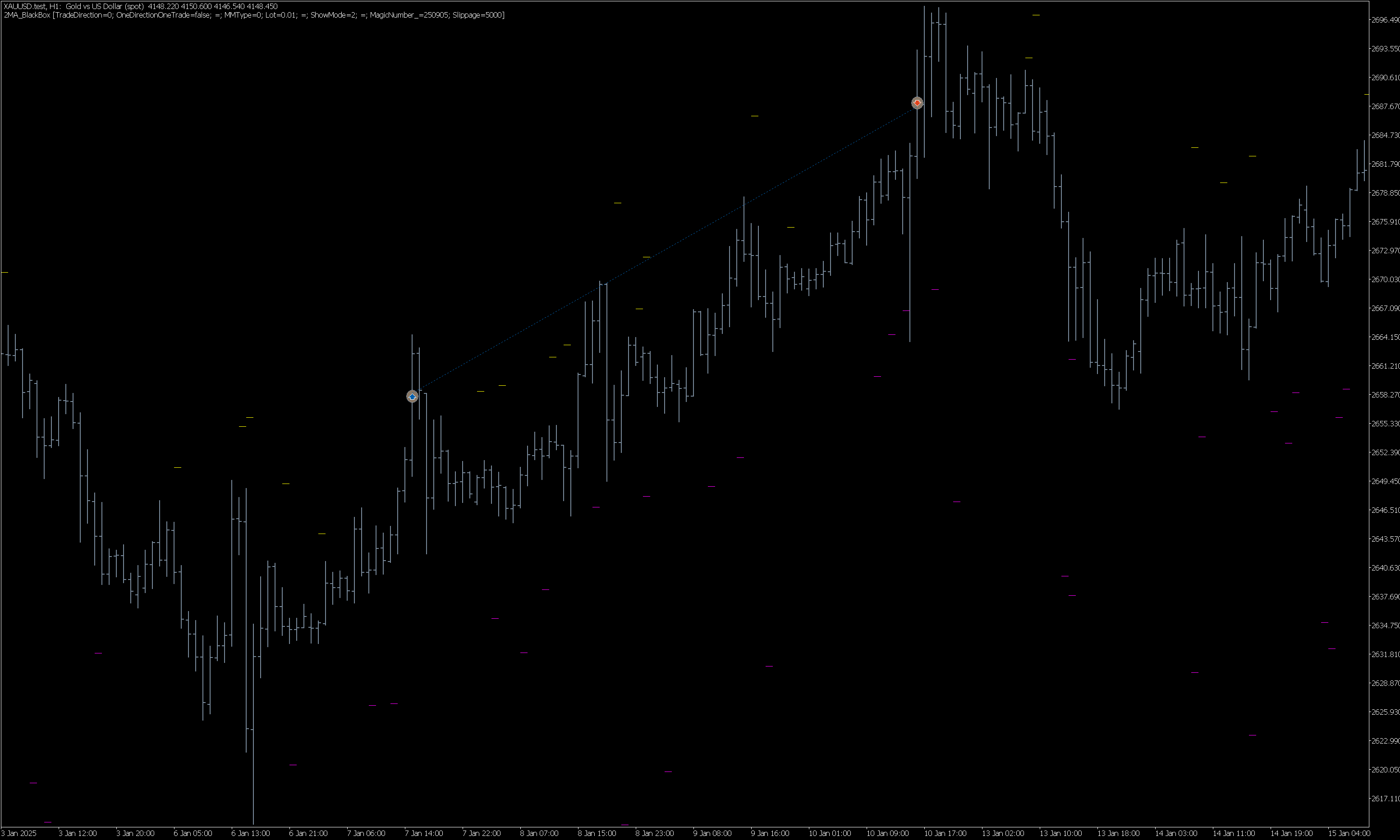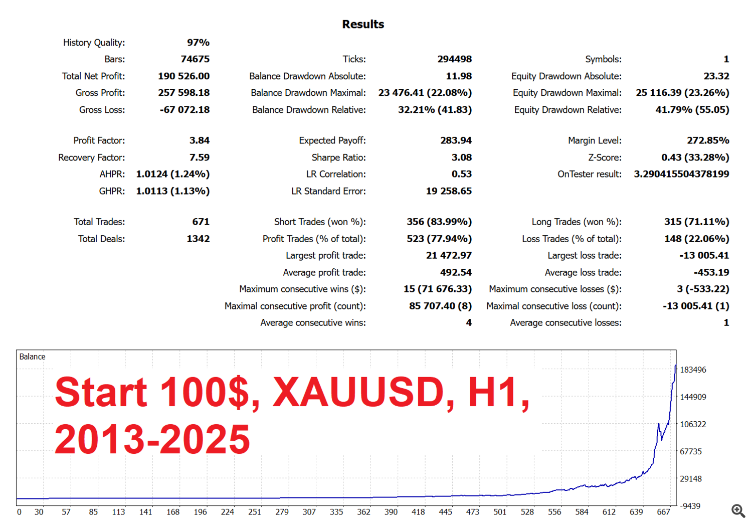 El asesor experto está configurado para el oro (XAUUSD) en el marco temporal de 1 hora (H1). Sin embargo, puede utilizarlo con cualquier símbolo y marco temporal, tras comprobar los resultados en el probador.