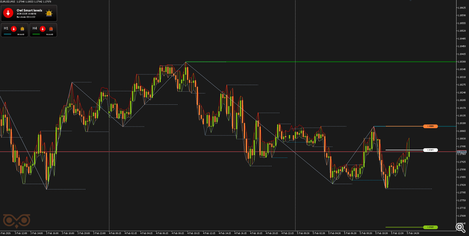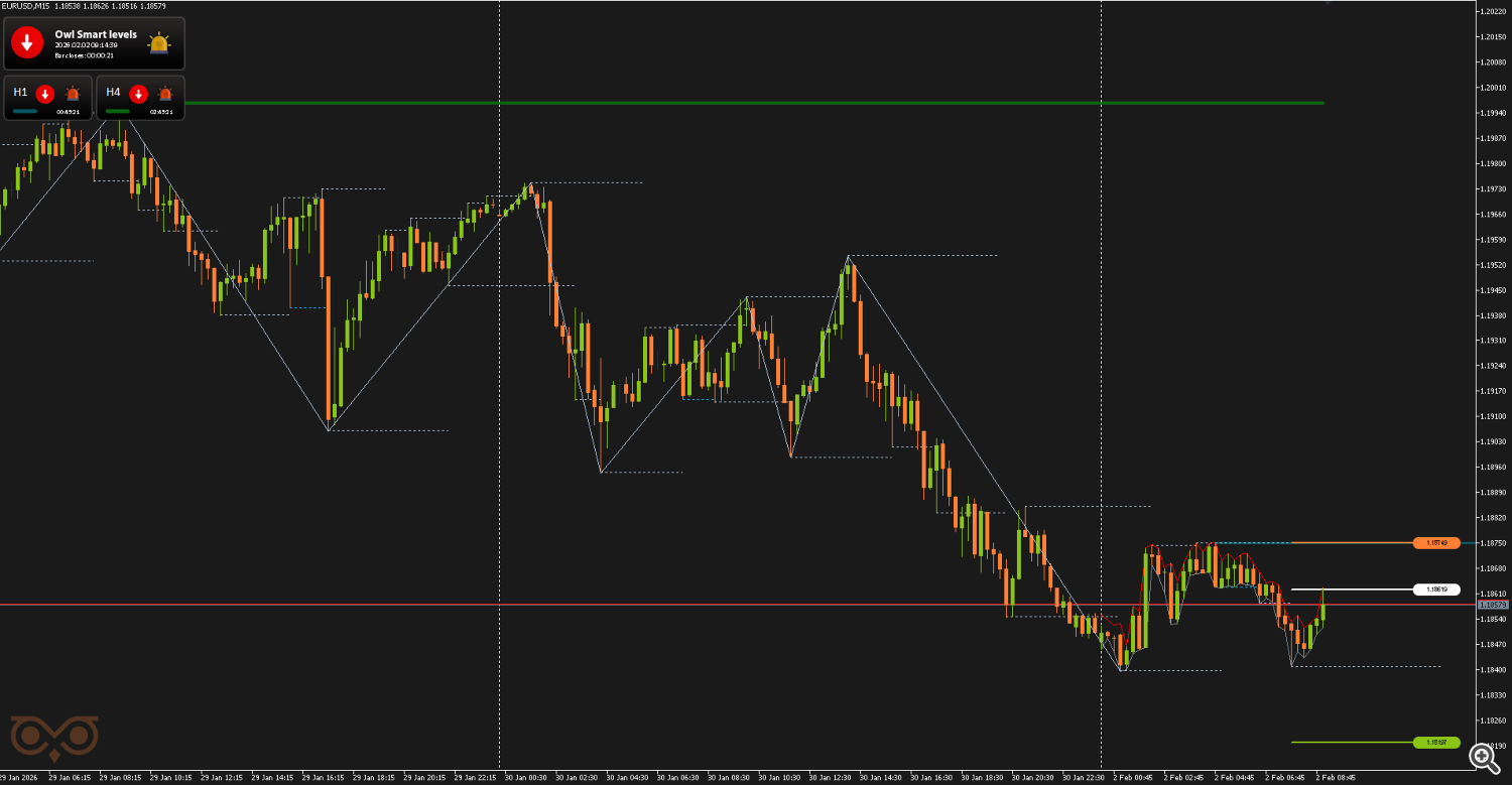La primera operación con el par de divisas EURUSD se abrió por la señal del indicador Owl Smart Levels el lunes 2 de febrero de 2026, en el timeframe M15, tras la confirmación de la dirección del movimiento en los marcos temporales H1 y H4.