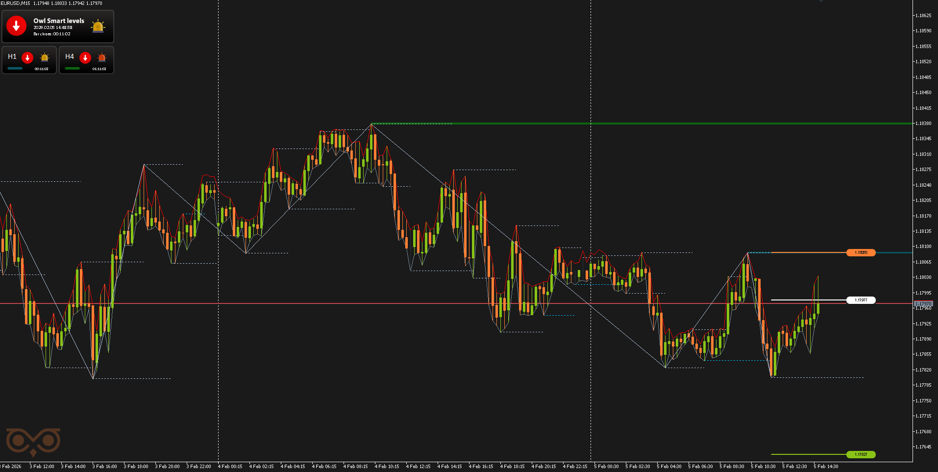 La segunda operación con el par de divisas EURUSD se abrió por la señal del indicador Owl Smart Levels el jueves 5 de febrero de 2026.