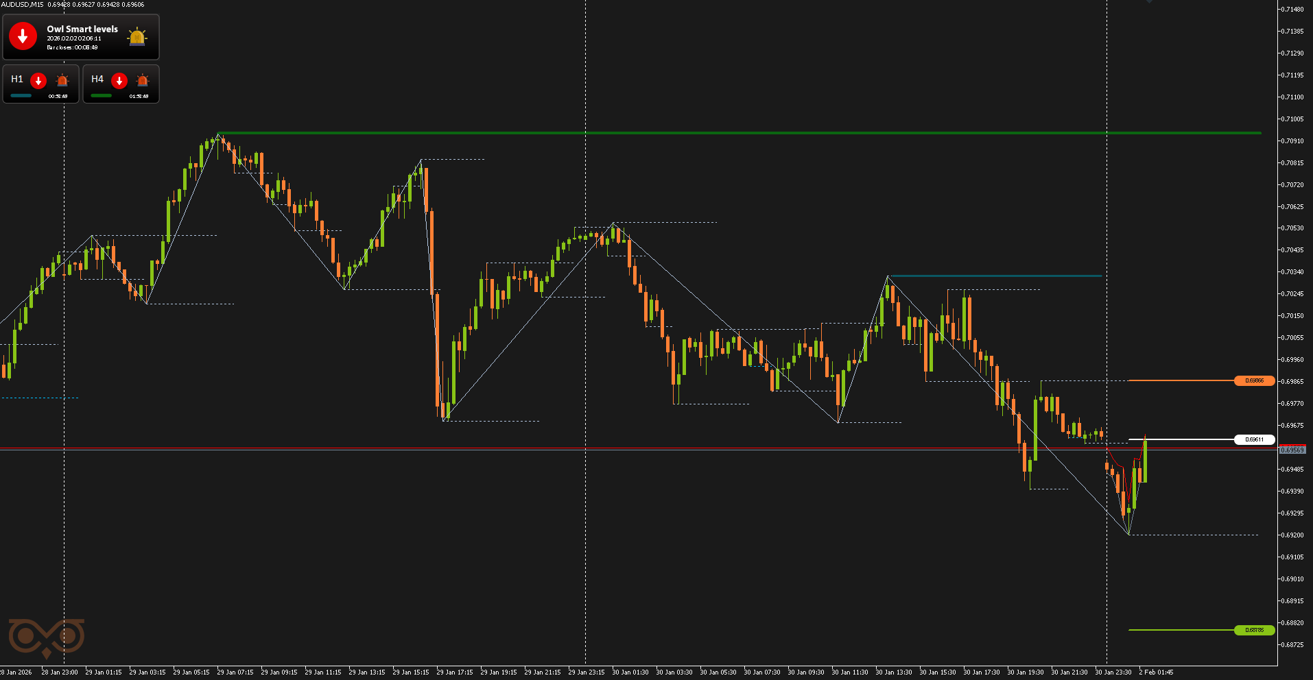 La primera operación con el par de divisas AUDUSD se abrió por la señal del indicador Owl Smart Levels el 2 de febrero de 2026.