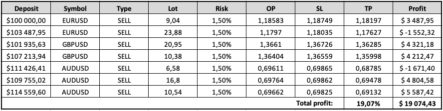 Durante la semana pasada se realizaron 7 operaciones, con un saldo global positivo. El indicador Owl Smart Levels y el sistema de trading desarrollado sobre su base demostraron su eficacia en el trading y generaron una ganancia de 19 074,43 $, lo que supone un 19,07 % del depósito. Los datos detallados se presentan en la tabla final.