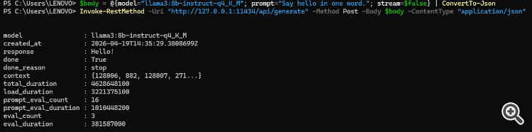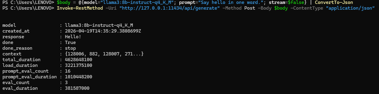 $body = @{model="llama3:8b-instruct-q4_K_M"; prompt="Say hello in one word."; stream=$false} | ConvertTo-Json