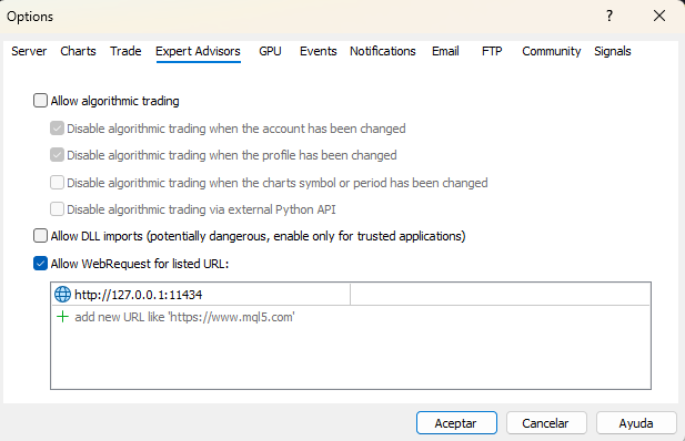 Fig. 3. MetaTrader 5 WebRequest configuration: enabling HTTP access to the local Ollama server at 127.0.0.1:11434