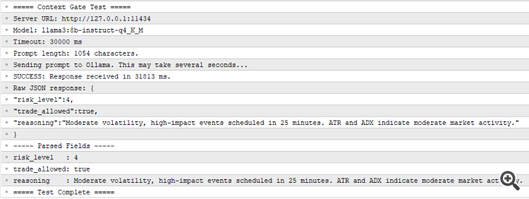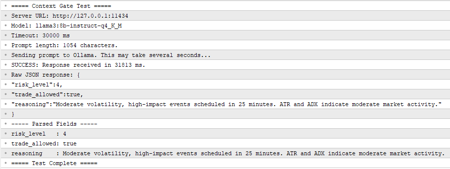 - ContextGate_Test.mq5—Standalone script for validating the Ollama connection and prompt format without running a full EA. Prints the raw and parsed response to the Experts tab. Place in MQL5/Scripts/.