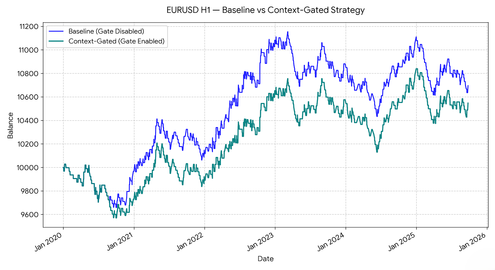 The baseline configuration with the gate disabled produced a representative example of a context-blind EA: all crossover signals were executed regardless of market conditions, including periods of abnormal volatility around major economic releases. The gated configuration produced fewer trades, with most of the eliminated signals occurring during the highest-volatility bars, where ATR exceeded 1.5 times its long-term average. The net profit curve in the gated version was smoother, and the maximum drawdown was reduced, while the total return remained comparable to the baseline.