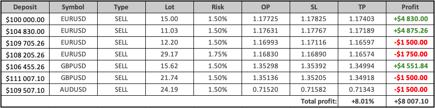 En total se abrieron 7 operaciones durante la semana. De ellas, 3 operaciones se cerraron en TakeProfit, mientras que 4 operaciones terminaron en StopLoss. El resultado global de todas las operaciones de la semana fue de +$8 007.10, lo que corresponde a un +8,01% del depósito.
