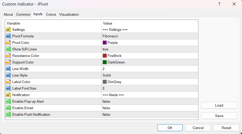| PivotMethod | Fibonacci | Choose formula (Standard, Fib, Camarilla, Woodie, DeMark) |