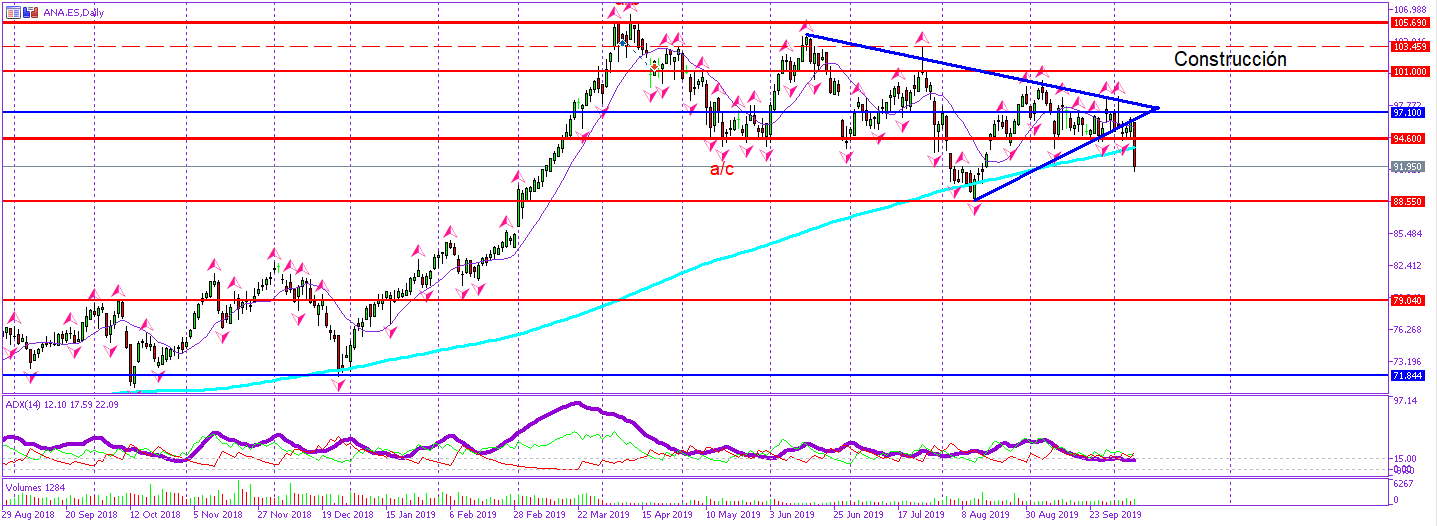 Acciona, estaba sometida en un periodo lateral muy aburrido, estructura que podría hacer detonar a las cotizaciones en cualquier dirección. En intradiario vemos una gran fuerza bajista, tras romper el activo, el dique de los 94.60 euros e incluso llevándose por delante la media móvil de 200 periodos, haciendo este movimiento una salida de los precios de la figura de cuña (señalada de color azul sobre la gráfica). Ante esta tesitura, es probable que la acción provoque un movimiento de continuidad hacia el siguiente soporte de relevancia ubicado en los 88.55 euros, zona a vigilar, puesto que el consenso de mercado podría tomar decisiones ante la misma. Posiblemente el quiebre del mencionado soporte, podría dejar en un nuevo abismo al activo, pero ojo, valorar bien que formación quieren hacer los precios en la citada zona.