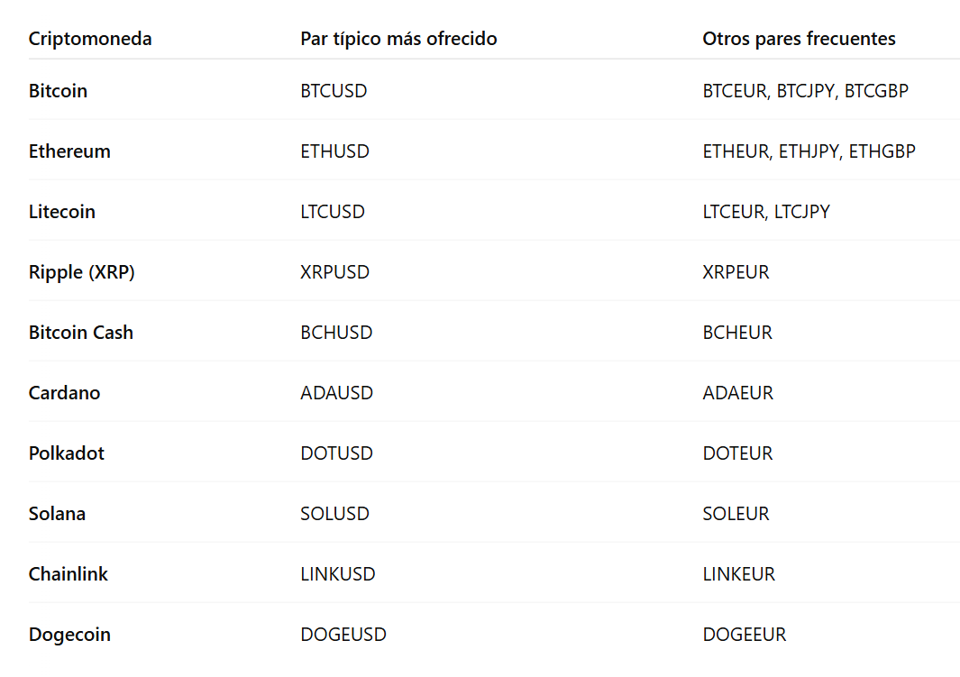 Como dice Miguel Ángel, no todos los brókers permiten comerciar con criptos. Además, los que sí, a menudo tienen condiciones diferentes como un apalancamiento inferior, tamaño máximo de lote distinto, etc. Utiliza el truco que te ha dicho Miguel Ángel, te paso una lista de los principales pares que permiten los brókers para que busques si tu bróker te permite operar con ellos.
