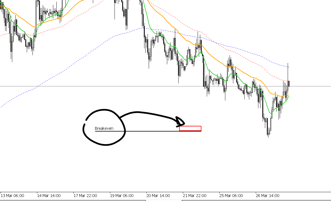 Linea negra con el texto "Breakeven" en la descripcion del objeto. Sale asi, podria ser que quedase en la parte roja?? He visto que haciendo click derecho sobre el recuadro de texto donde escribes la descripcion (dentro de la confi de la linea) hay un menu interno pero si esta la opcion no acierto a que se me coloque de esa forma.