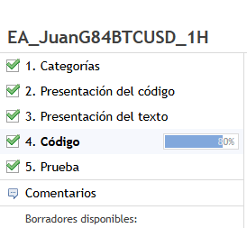 Buenas tardes, he empezado hace poco a usar esta comunidad y me hace especial ilusión comenzar a publicar mis códigos de Indicadores y Asesores Expertos que a partir de ahora voy a empezar a crear. Una vez superada la prueba, la barra se me queda en 80% y no me da la opción a publicar los códigos, alguien me puede ayudar?