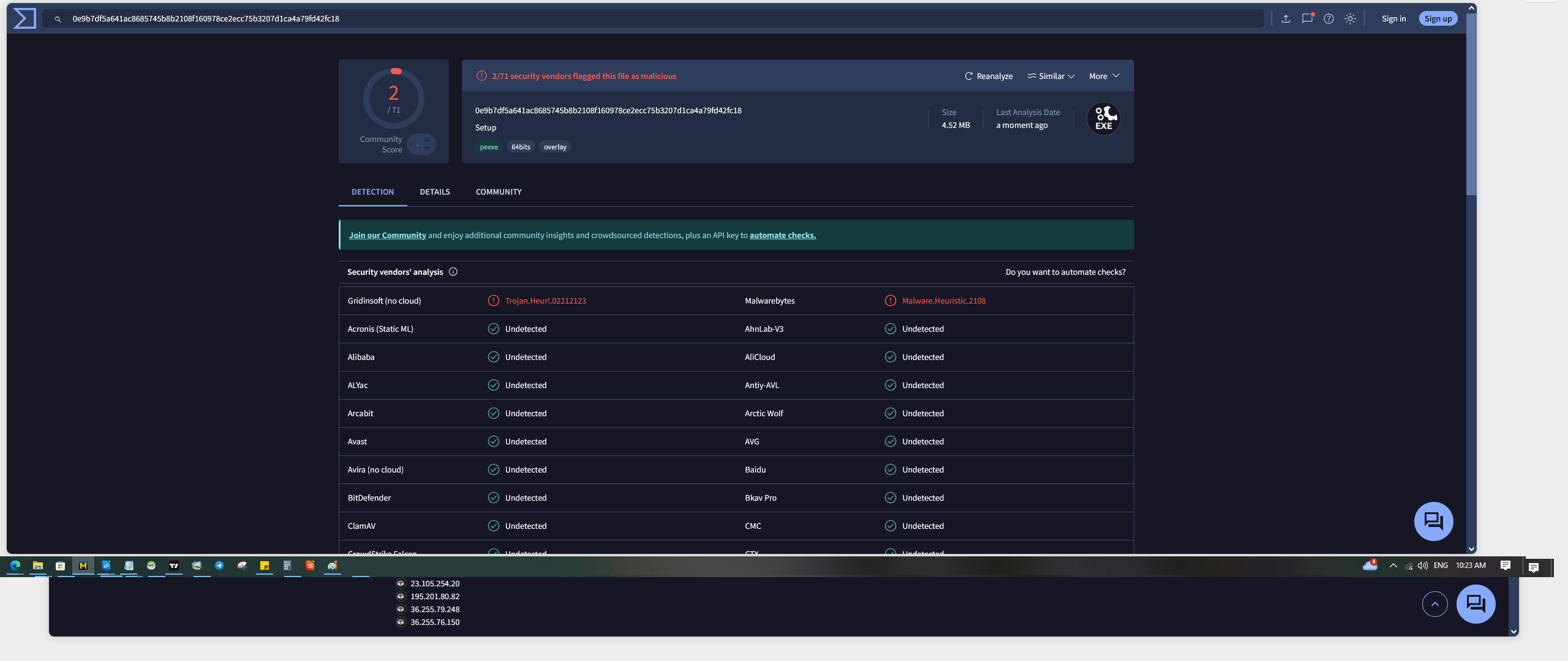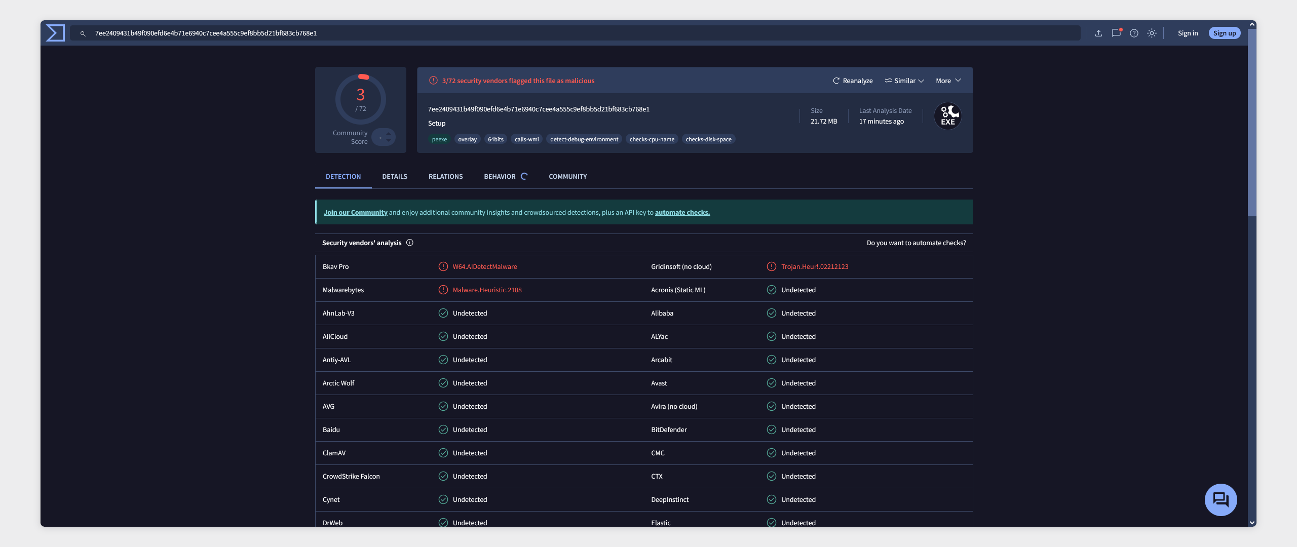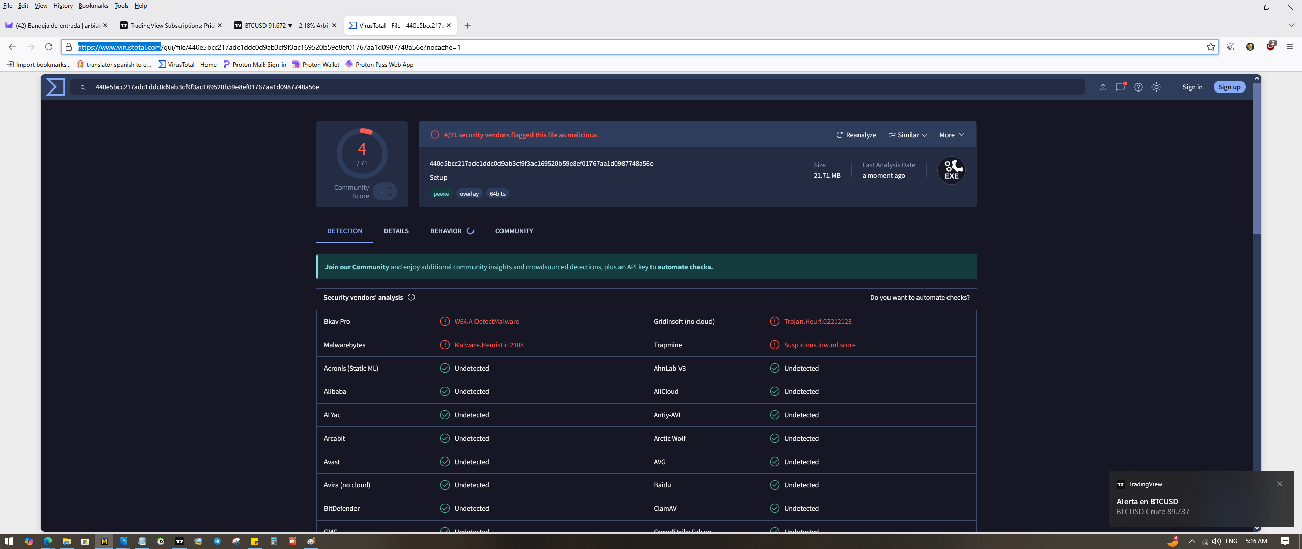 Saludos, hace días he tratado de instalar el MT5 en mi Windows, cada vez que lo bajo ya sea directo de la web oficial o atreves de otra plataforma por ejemplo como de FTMO, siempre me dirige hacia un vinculo de la web oficial, cuando descargo el archivo, siempre lo reviso en la web de Virustotal (https://www.virustotal.com), y me informa que esta contaminado, lo cual me hace difícil de instalar para no contaminar mi sistema.