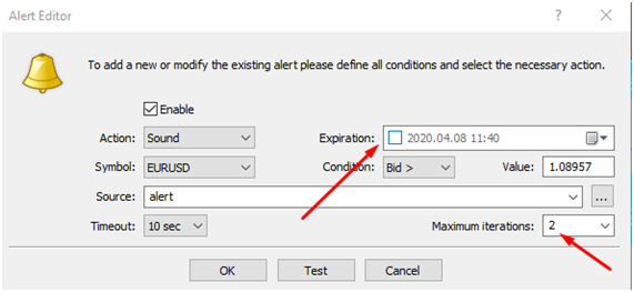 Se requiere que las alertas por defecto no tengan vencimiento y que tenga máximo 2 iteratiums: