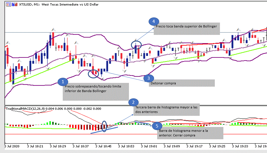 Compra automática con base en Bollinger+MACD. Compra automática de petróleo (XTIUSD) cuando estos dos indicadores (Bollinger+MACD) reúnan 2 condiciones. Operaciones de poco lotaje y rápidas de poca exposición al mercado, con poca complejidad, únicamente utilizando dos indicadores.