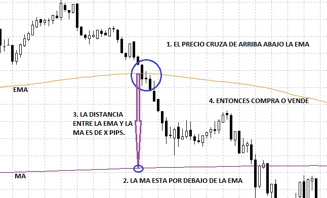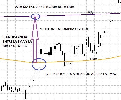 Cuando el precio cruza de arriba abajo la EMA, si la MA esta por debajo de la EMA, a una distancia de X o mayor, entonces compra o vende.