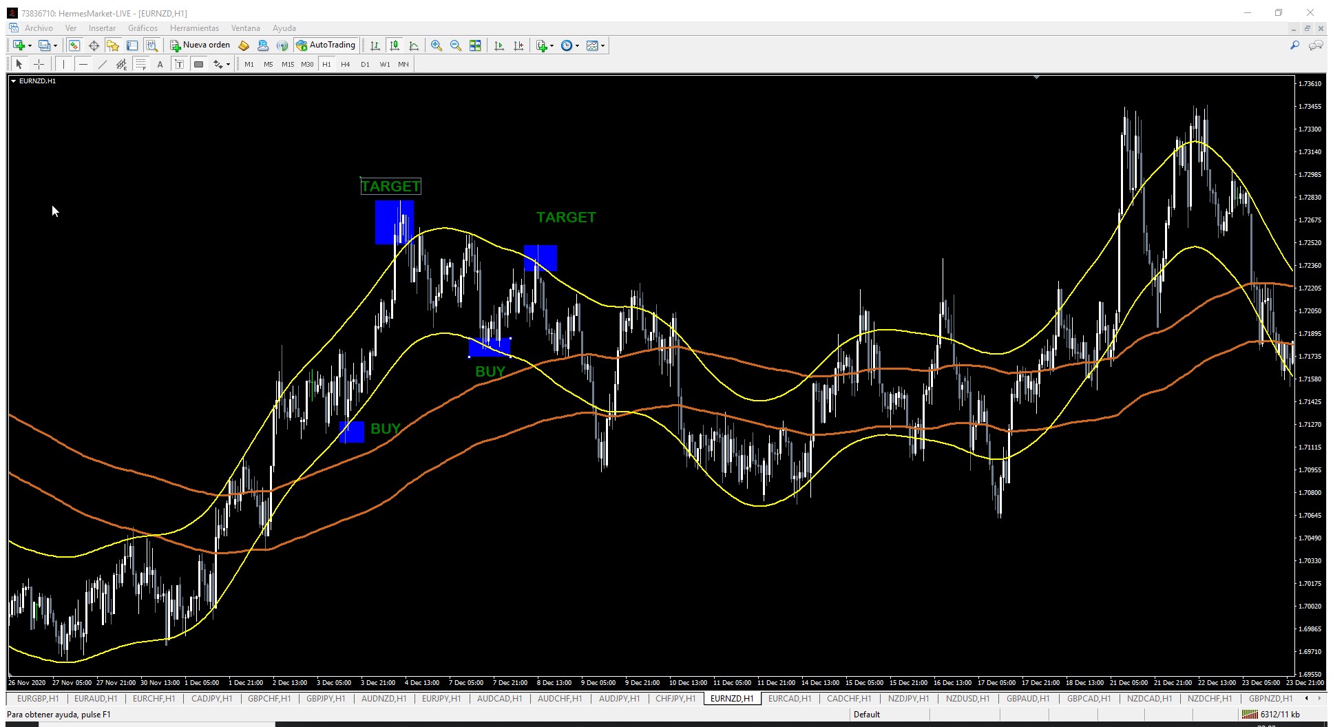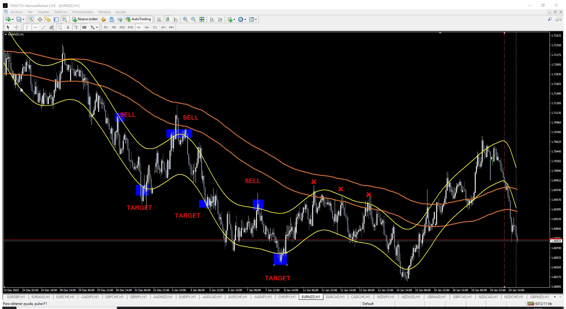 LA ESTRATEGIA ES MUY SENCILLA, REALIZAR VENTAS CUADNO EL CANAL AMARILLO ESTE POR DEBAJO DEL CANAL MARRON, LAS VENTAS SE ACABAN EN EL MOMENTO QUE EL CANAL AMARILLO TOQUE AL CANAL MARRON.