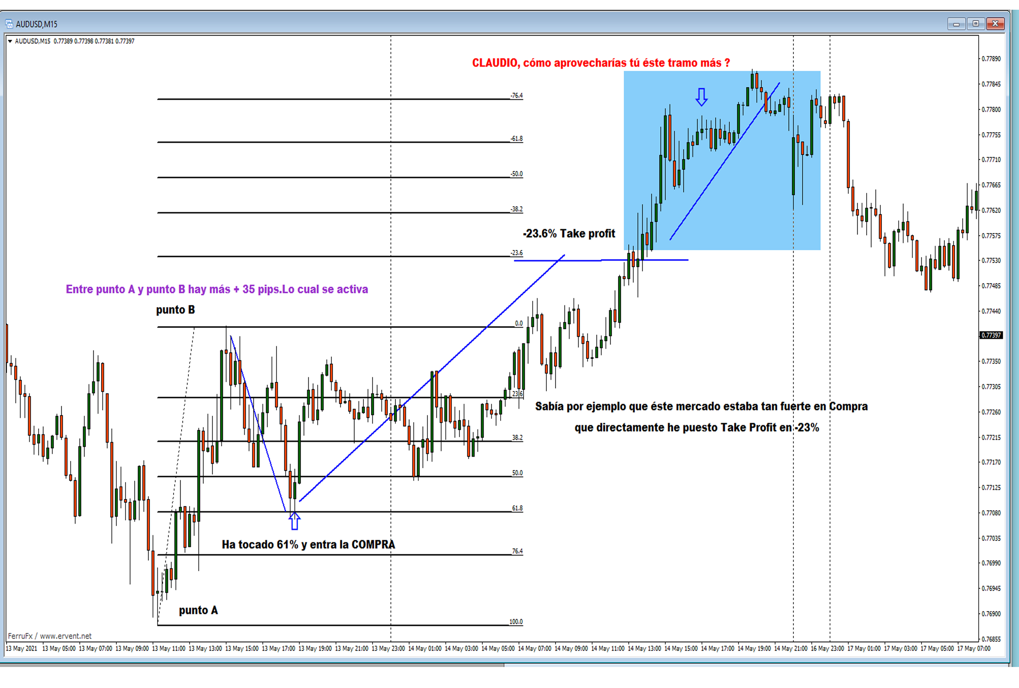 En el gráfico vemos que el fibonacci se tiene que actualizar al siguiente punto máximo del gráfico hasta llegar al punto D, ya que al no llegar al 50% vemos que hay un punto A inicial, un B, un C, pero hasta el punto D no retrocede hasta el 50% que es donde debe de meter la entrada.