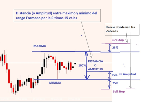 D ibujo de las posiciones de las órdenes para un número de velas de 15 y una “Distancia al rango” de 25.