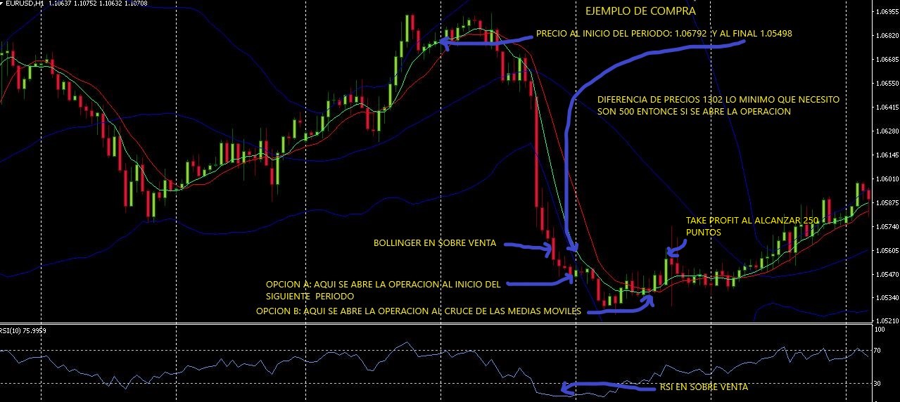 Opción A - Cuando el RSI y Bandas de Bollinger del dia anterior están al mismo tiempo en sobrecompra o sobreventa y al mismo tiempo la diferencia de precio de apertura y cierre del dia anterior es mayor a " x " se abrirá la operación al inicio de la primera hora del día en curso según a como lo marque el metatrader cuando inicia un nuevo periodo (Ojo: aquí no se usan las medias móviles estas podrán ser desactivadas). Si el rsi y Bollinger del dia anterior estan en sobre compra se abrira una operacion a la venta y viceversa si esta en sobreventa cumpliendo tambien con la diferencia de precios del dia anterior
