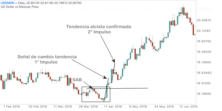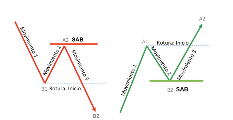 Básicamente seria buscar una tendencia, alcista o bajista, encontrar los dos últimos bajos o altos, (secuencia de altos y bajos), interpretar donde se encuentra el punto mas alto entre los dos últimos bajos o altos, que le llamaremos SAB, o clavicular, una vez señalada la clavicular, se deberá de esperar a que el precio rompa ese nivel, para poder empezare con la operativa de entrada, ya sea por una rotura nueva del sab, o por esquema de extremo o gatillo.