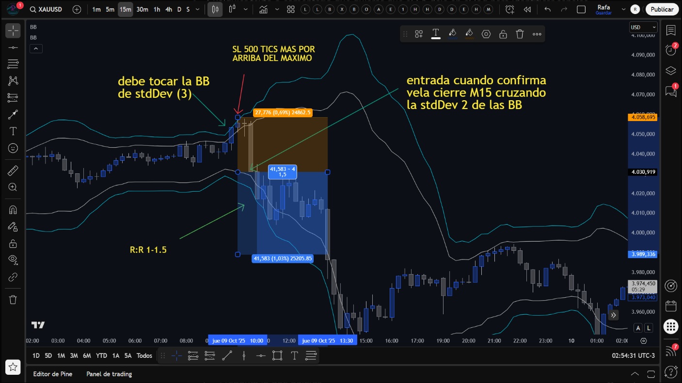 Paso 2 (Gatillo de Entrada): Después de que el Paso 1 ha ocurrido, el bot debe esperar a que una vela cierre por debajo de la Banda de Bollinger superior interior (la de Desviación 2). La venta se ejecuta inmediatamente al abrir la siguiente vela.