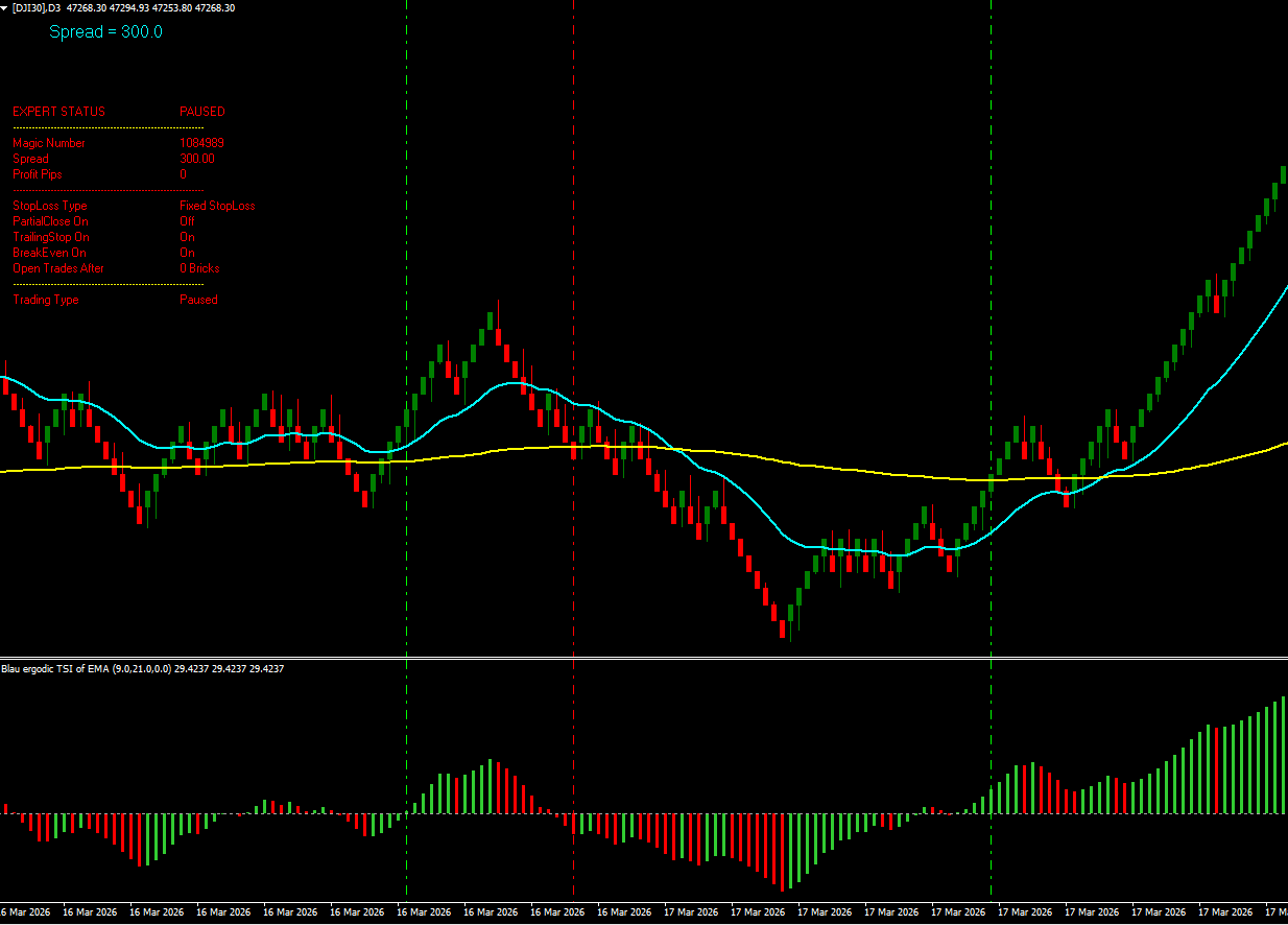 On the main chart, I have two EMAs, one at EMA 21 and the other at EMA 200 on a RENKO chart. I also often work with a standard timeframe, but the principle works and remains the same. In indicator window 1, I have a so-called Blau ergodic TSI or EMA; the first is at 9, the second at 21. In the existing EA, I have the option to use both EMAs in the main chart as well as the indicator in indicator window 1.
