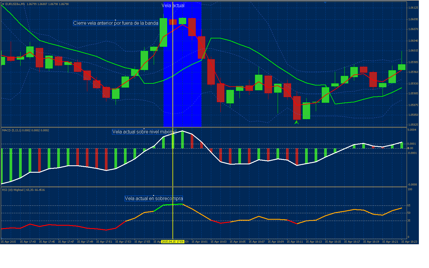 1. La vela anterior haya tenido un cierre o apertura por fuera de las líneas externas de las Bandas de Bollinger (pero que no repita en el caso de existir velas sucesivas con esta condición, solo dar aviso con la primera vez).