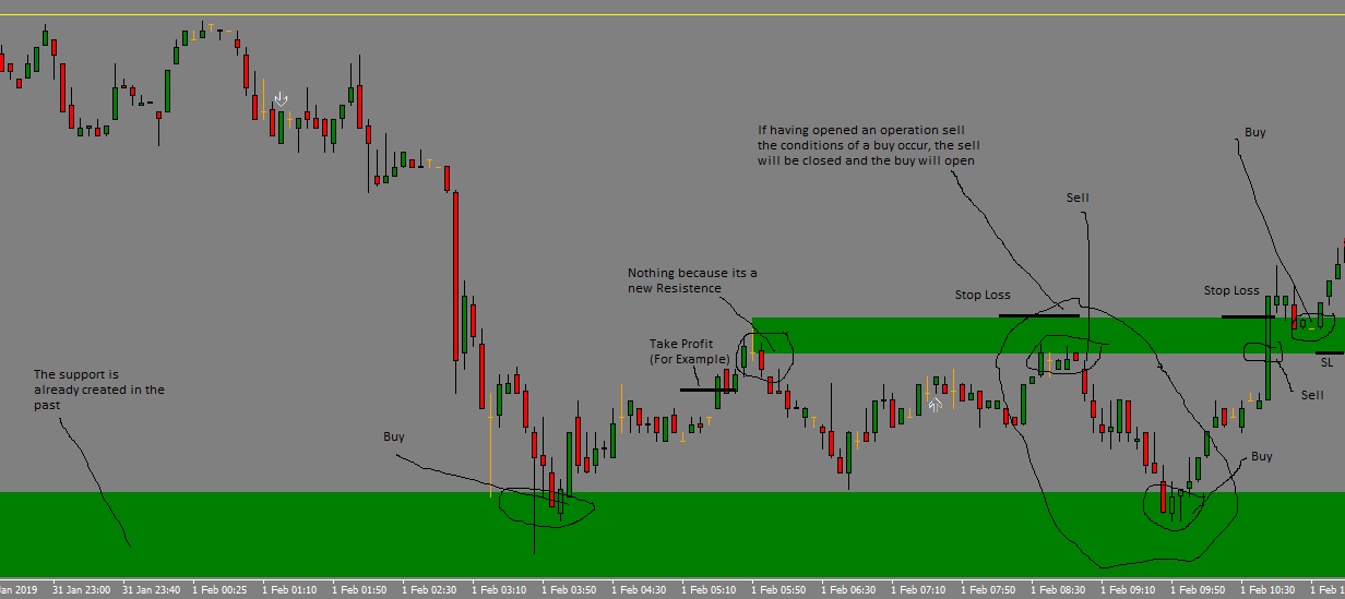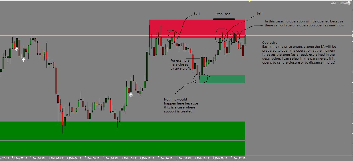 The opening of the operation would be when the price goes out in a drawn area, the take profit will be in principle always in € but the stop loss can be chosen or trailing stop / in € / or automatic (if it is the latter in the photo it is appreciated best)